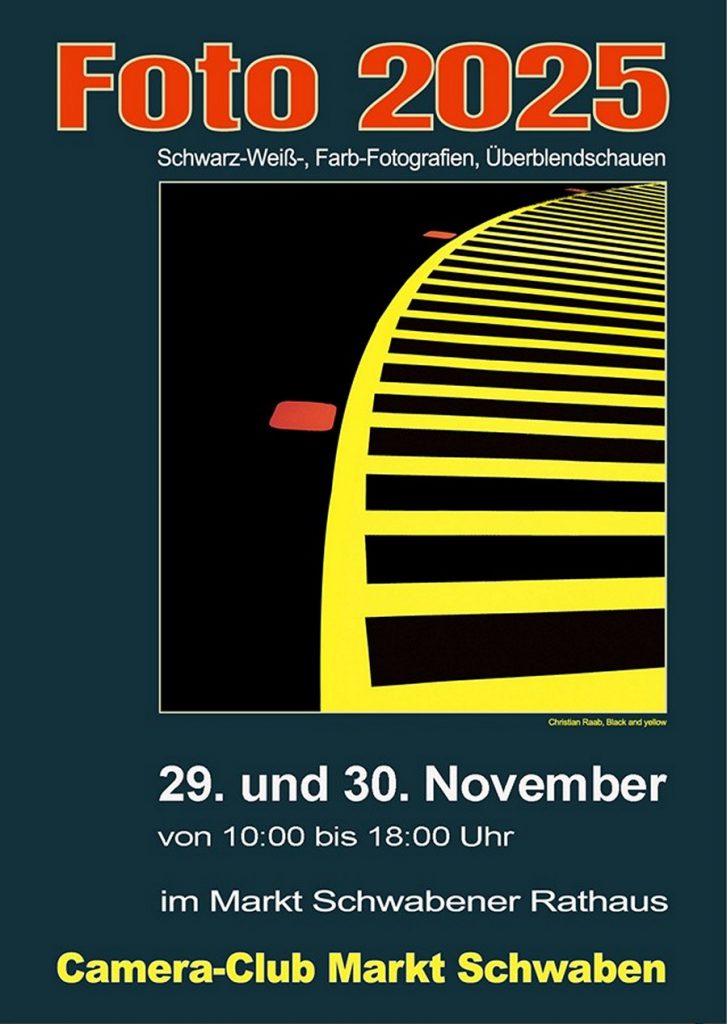 Der Camera-Club Markt Schwaben lädt jedes Jahr Ende November zu seiner Jahresausstellung ein, welche einen Rückblick auf das jeweilige Clubjahr gibt. Diese findet heuer am Wochenende des 29. und 30. November im Rathaus-Foyer statt. Die Ausstellung ist jeweils von 10:00 bis 18:00 Uhr geöffnet.