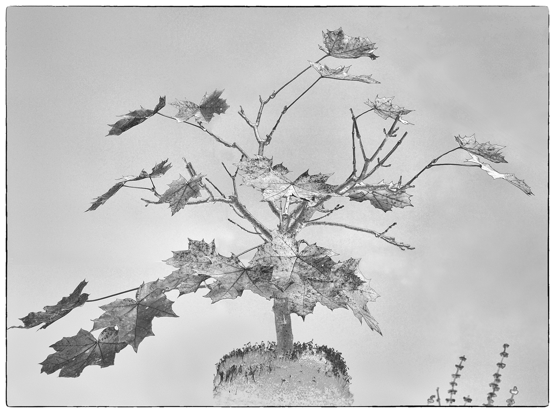 Weiter mit den Klischees: Bonsai kommt auch aus Japan. Das Bild zeigt mir die Vergänglichkeit der Jahreszeiten, es ist Herbst, die Blätter fallen ab.
