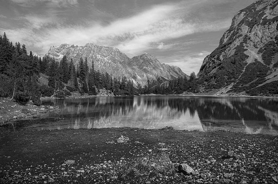 Hochgebirgslandschaften zwischen Berchtesgaden und Oberstdorf erfreuen den Schwarz-Weiß-Fotografen durch klassische Motive.